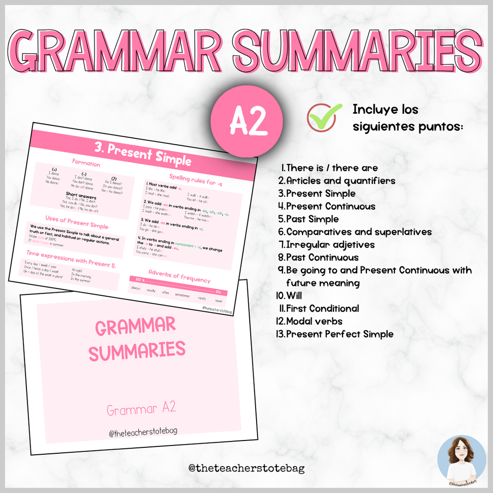 Pack de infografías con resúmenes de todos los puntos gramaticales incluidos en el nivel A2 según el MCRE. ¡Tendrás la gramática para todo el año escolar en un solo PDF y la puedes reutilizar para siempre!