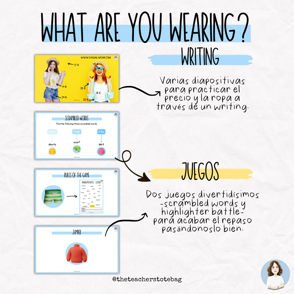 Este bundle es un recurso completísimo para trabajar el vocabulario de ropa, el present continuous y la producción escrita y oral de manera motivadora y visual.