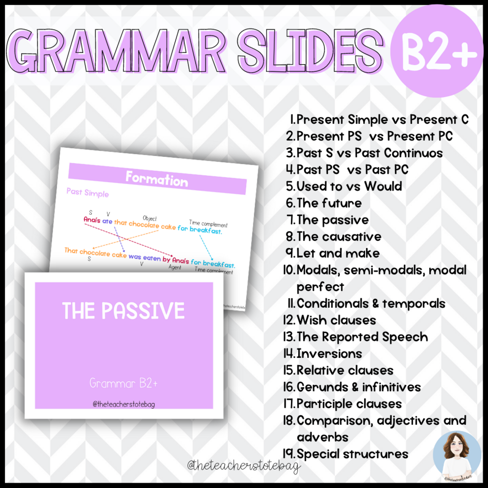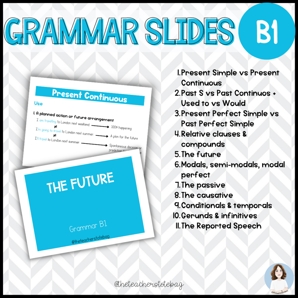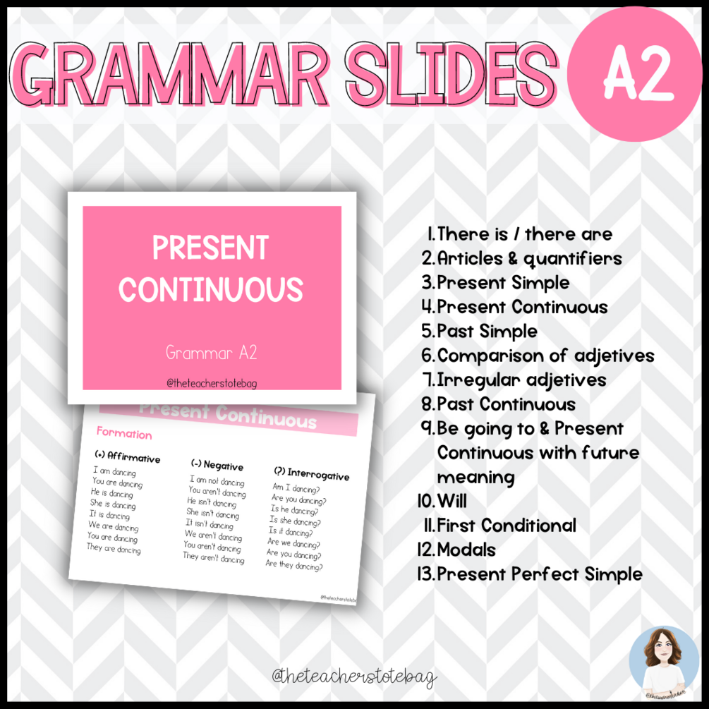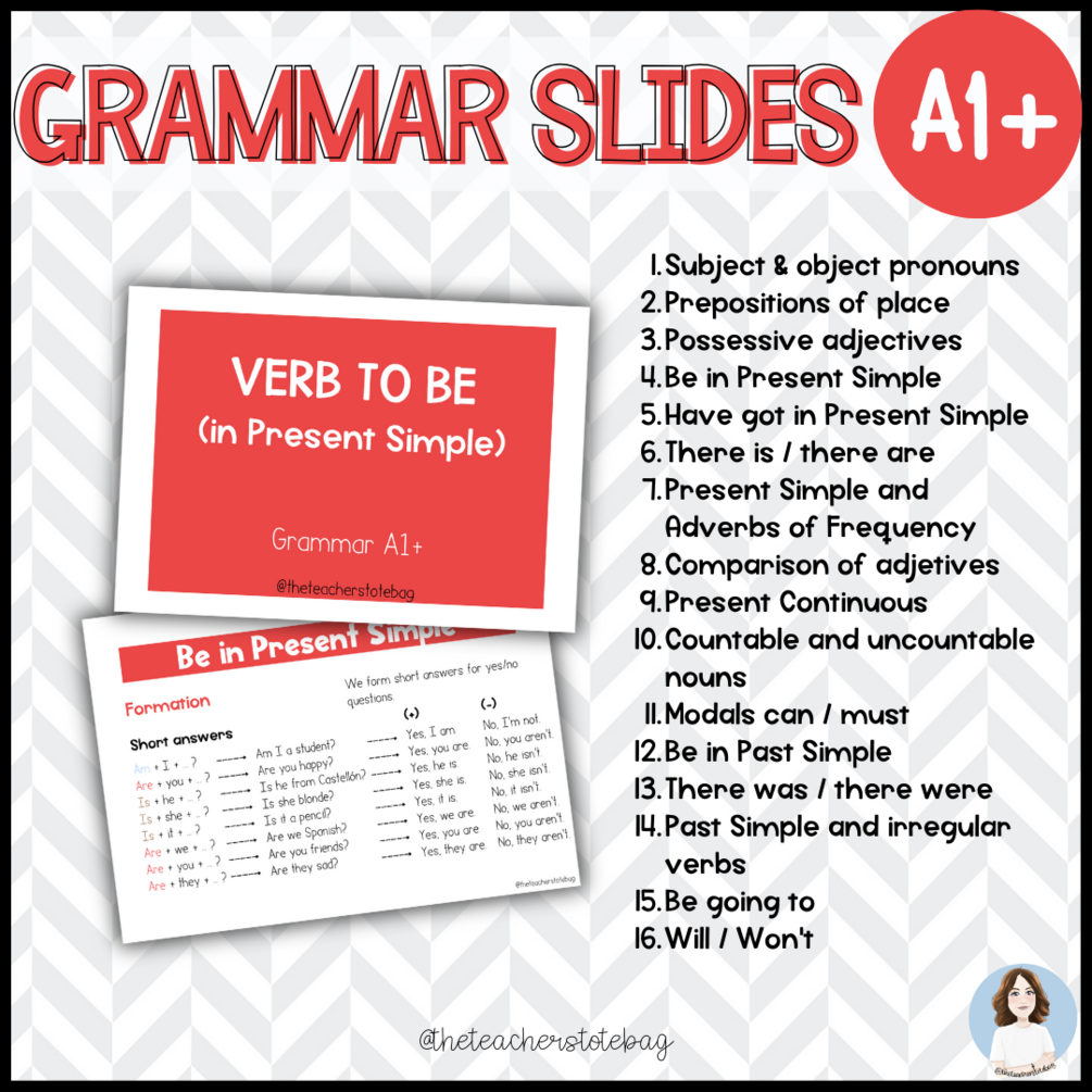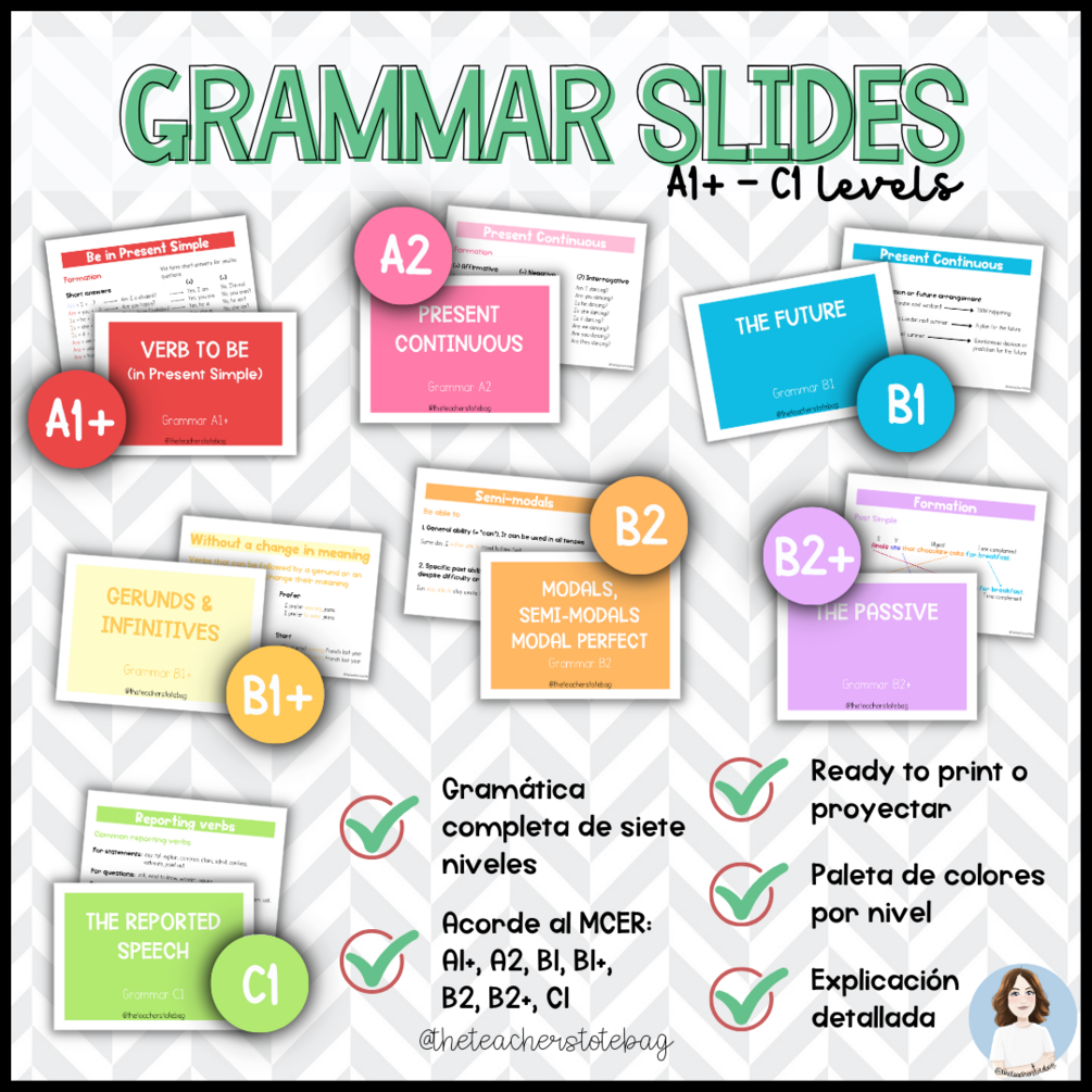 Pack de presentaciones con explicaciones de todos los puntos gramaticales incluidos en los niveles A1+, A2, B1, B1+, B2, B2+, C1 según el MCRE. ¡Tendrás la gramática para todo el año escolar en un solo PDF y la puedes reutilizar para siempre y de todos los niveles!