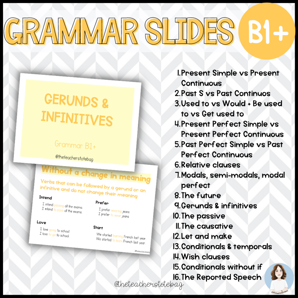 Pack de presentaciones con explicaciones de todos los puntos gramaticales incluidos en los niveles A1+, A2, B1, B1+, B2, B2+, C1 según el MCRE. ¡Tendrás la gramática para todo el año escolar en un solo PDF y la puedes reutilizar para siempre y de todos los niveles!